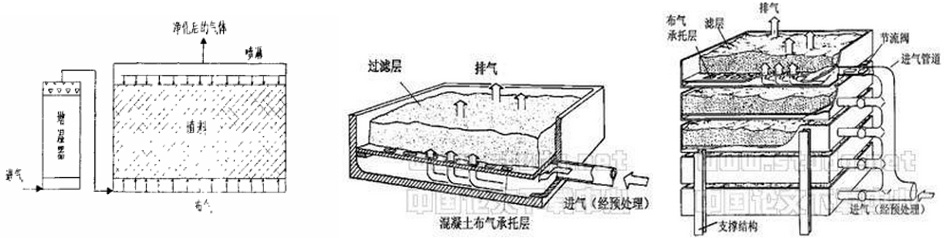 臭氣通過生物活性填料床時(shí),從氣相轉(zhuǎn)移到附著在坑料床中的微生物細(xì)胞,進(jìn)而被氧化分解。生物濾池處理臭氣的工藝流程如圖所示。